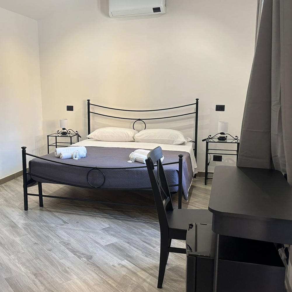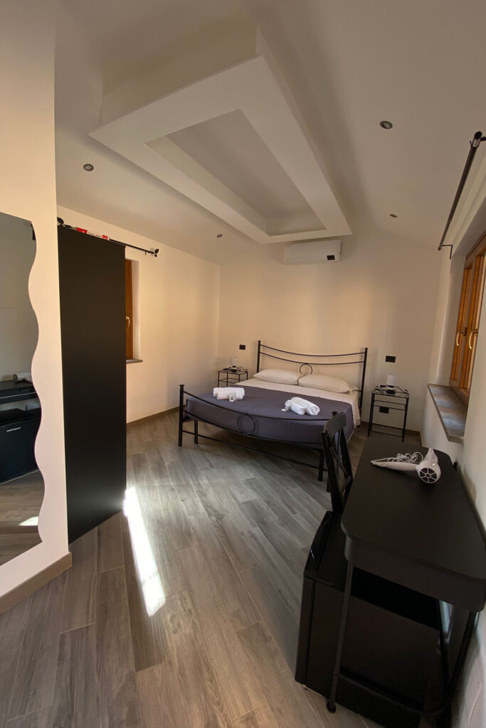 Un’oasi di eleganza e comfort, caratterizzata da pareti bianche e luminose finestre in legno che donano calore e accoglienza. Gli arredi grigi, abbinati al pavimento effetto legno, creano un ambiente moderno e armonioso. Il letto in ferro battuto, impreziosito da un copriletto grigio in perfetta sintonia con le tende, regala un tocco di fascino classico. Il bagno privato, rivestito in pregiato marmo scuro, offre uno spazio raffinato e contemporaneo, ideale per rilassarsi con stile. Una camera doppia pensata per chi desidera un soggiorno intimo e sofisticato.