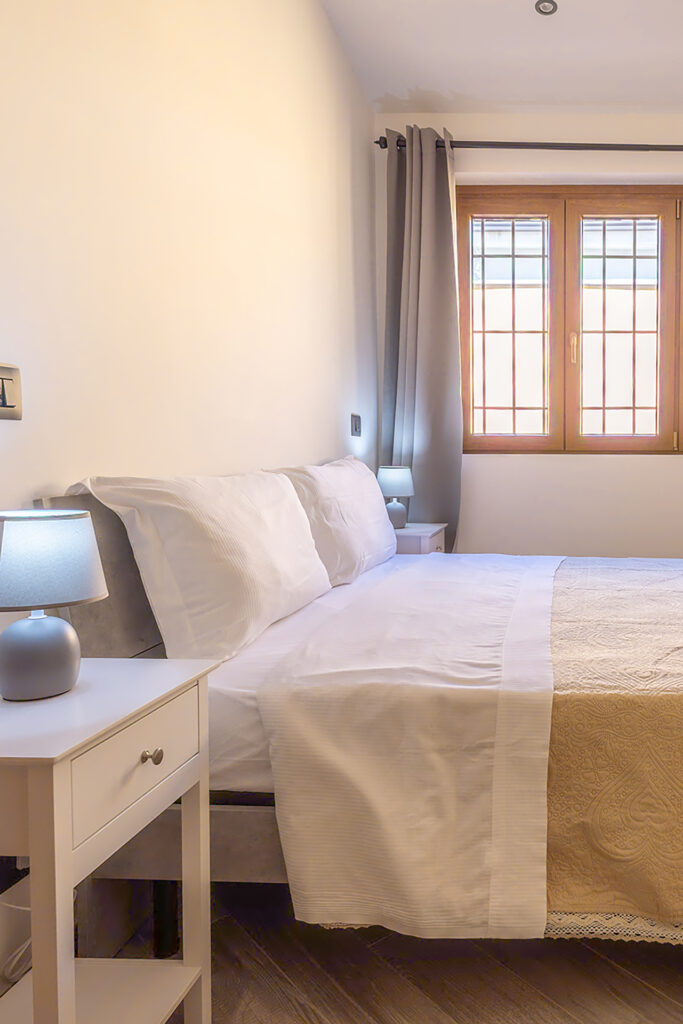 La Suite Venere è un rifugio di charme, dove delicatezza ed eleganza si fondono. Le pareti bianche amplificano la luce che filtra dalle finestre in legno, creando un ambiente arioso e accogliente. Gli arredi grigi e il pavimento effetto legno donano un equilibrio contemporaneo, mentre il bagno in marmo scuro offre modernità e raffinatezza. Il letto, impreziosito da un copriletto beige, invita al relax. Questa suite è la scelta ideale per chi desidera un soggiorno all’insegna della bellezza e della serenità.